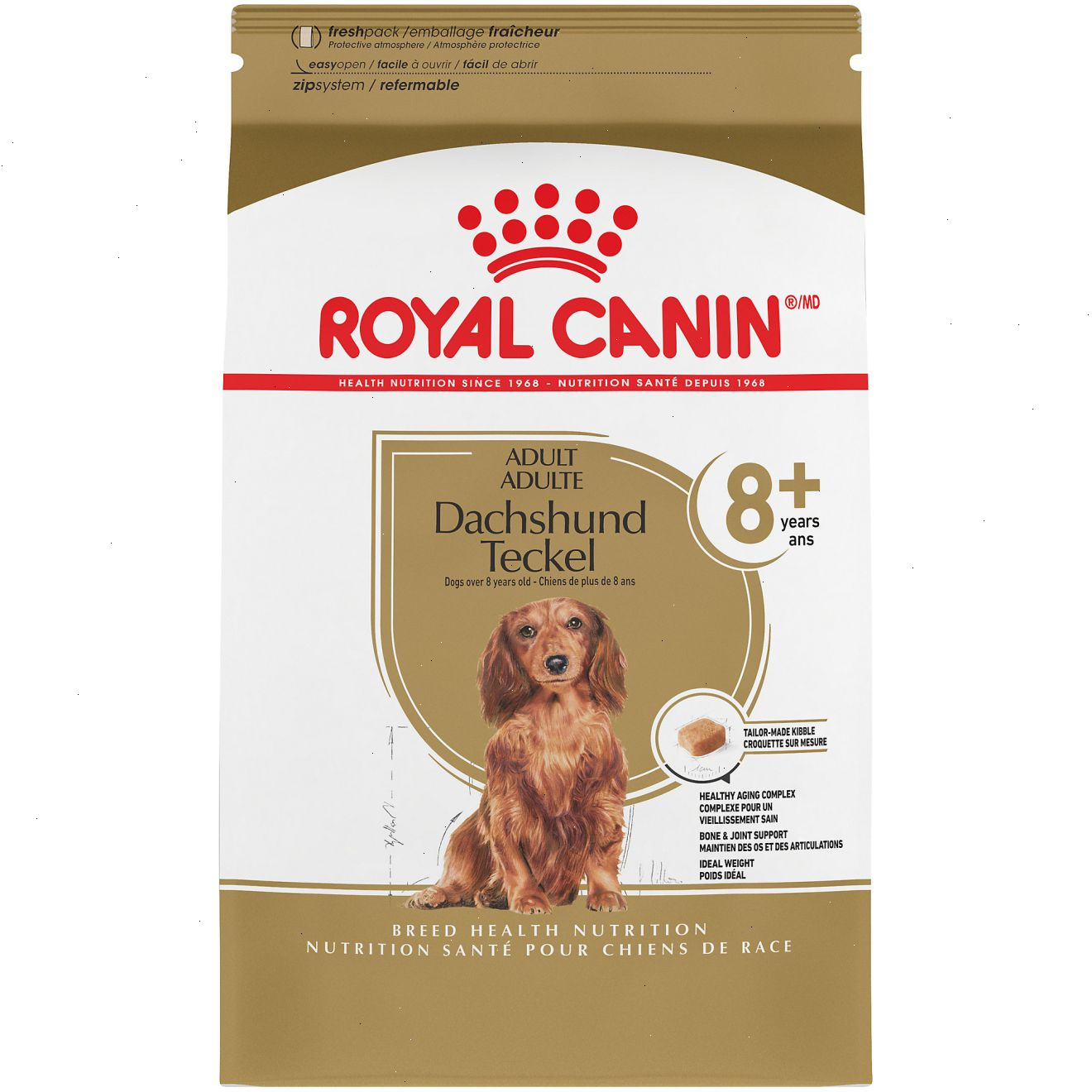 Royal Canin Dachshund Adult 8+ dry dog food is tailor-made nutrition created just for your pure breed senior Dachshund. Whether you have a miniature or standard Dachshund, this exclusive breed-specific diet is uniquely formulated for your older Dachshund, with the specific nutrients to help them thrive. The small kibble is highly palatable and easily rehydratable with warm water to make it soft and easy for tiny jaws and older teeth to eat. An exclusive blend of nutrients and antioxidants helps promote healthy aging. Precise levels of calcium and phosphorus support bone and joint health. And to help prevent your older sausage dog from getting too plump, this formula contains adjusted nutrients and calories so they can maintain an ideal weight.