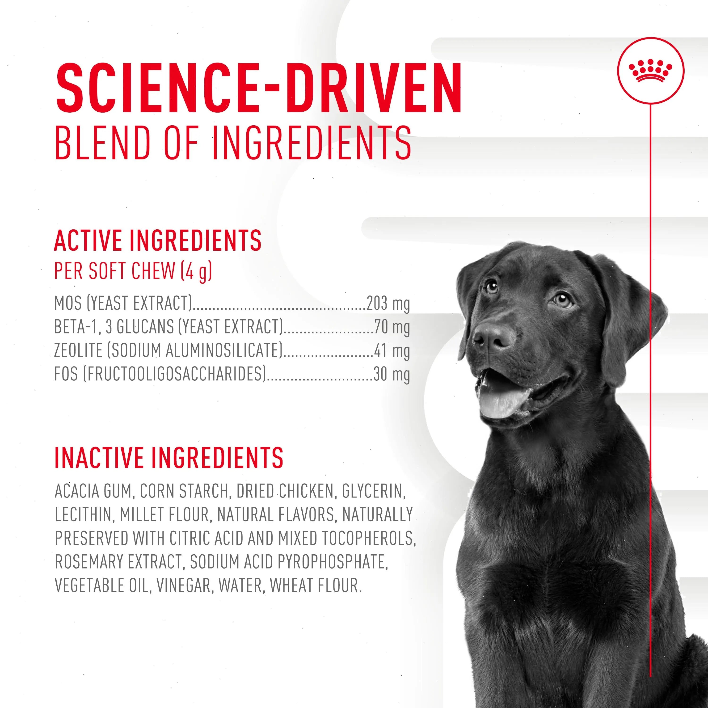 Royal Canin Digestive Health Supplement Adult Soft Chews are designed to support your dog’s digestive health and a balanced gut microbiota. Developed by veterinarians, these supplements are specially formulated with a science-driven blend of ingredients and designed to help support your dog’s health from the inside out. They include prebiotics that help maintain a healthy balance of gut bacteria, and beta-glucans (postbiotics) that support healthy digestion and stool quality. Plus, they contain zeolite, a natural mineral clay that helps reduce stool odor. Be sure to follow the on-pack feeding guidelines and give your dog no more than the recommended number of pieces per day.