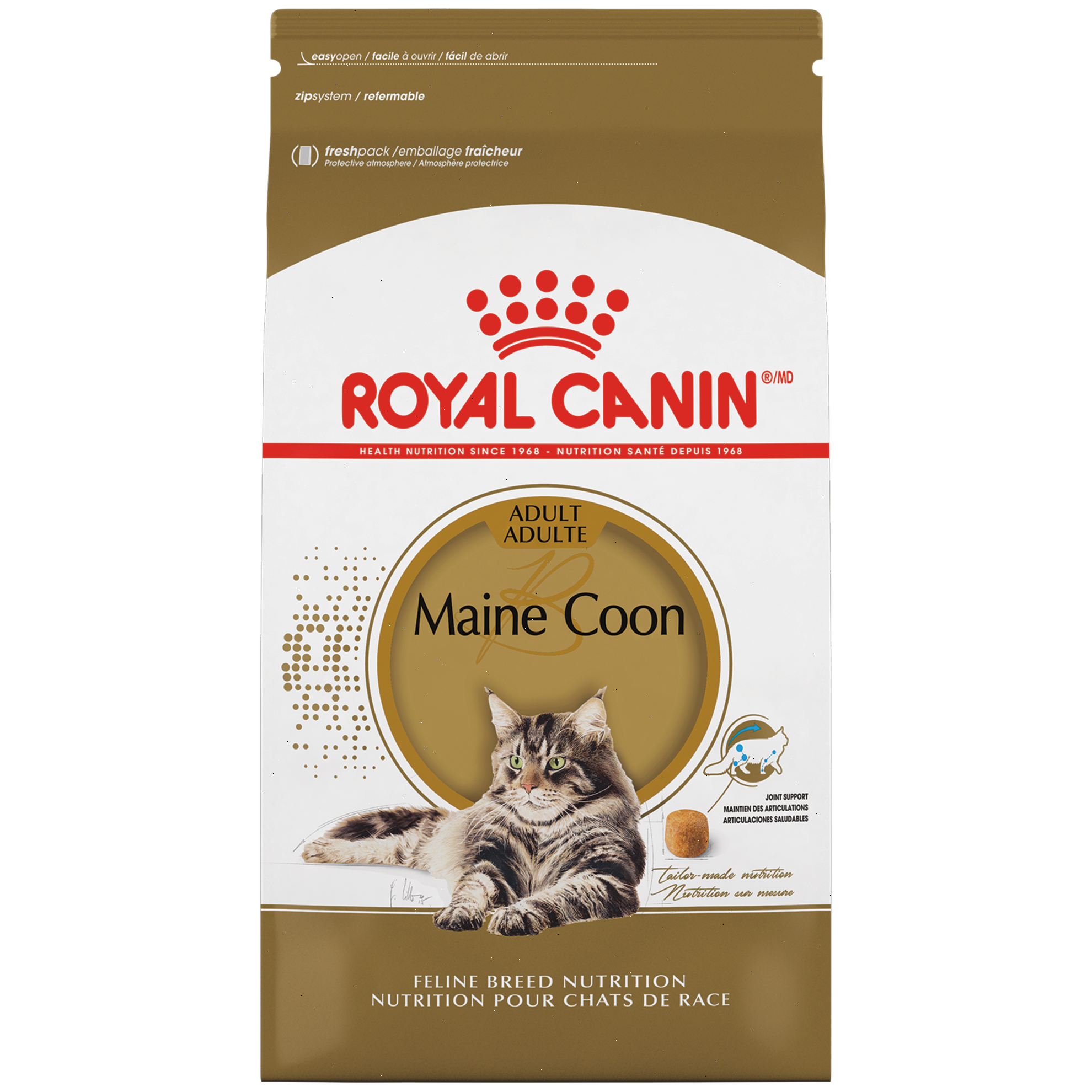 Royal Canin knows that what makes your Maine Coon cat magnificent is in the details. With their rugged good looks and long, shaggy coats, it’s easy to fall in love with these big cat beauties. As the largest of the cat pure breeds, they need precise nutrition to help keep their hearts healthy and bones and joints strong. Royal Canin Adult Maine Coon dry cat food is tailor-made nutrition created just for the Maine Coon breed. This exclusive dry formula contains important nutrients like taurine to promote good cardiac health, and EPA and DHA to support healthy bones and joints. Essential nutrients, including amino acids, vitamins, and omega-6 and omega-3 fatty acids, help keep your Maine Coon’s skin healthy and their shaggy coat shiny and soft. And the exclusive cube-shaped cat kibble is specially designed for a Maine Coon’s large square jaw—so that they can slow ingestion, chew thoroughly, and crunch away tartar buildup. Mix in or complement with Royal Canin Maine Coon Thin Slices in Gravy wet cat food for a meal that’s sure to please.